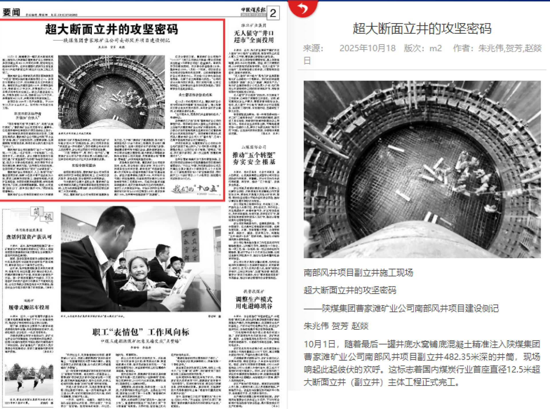 中国煤炭报 | 超大断面立井的攻坚密码——陕煤集团曹家滩矿业公司南部风井项目建设侧记
