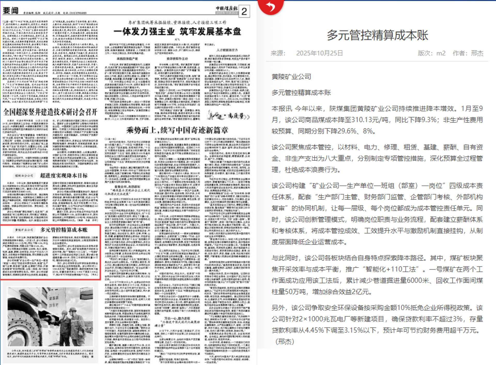 中国煤炭报 | 黄陵矿业公司多元管控精算成本账