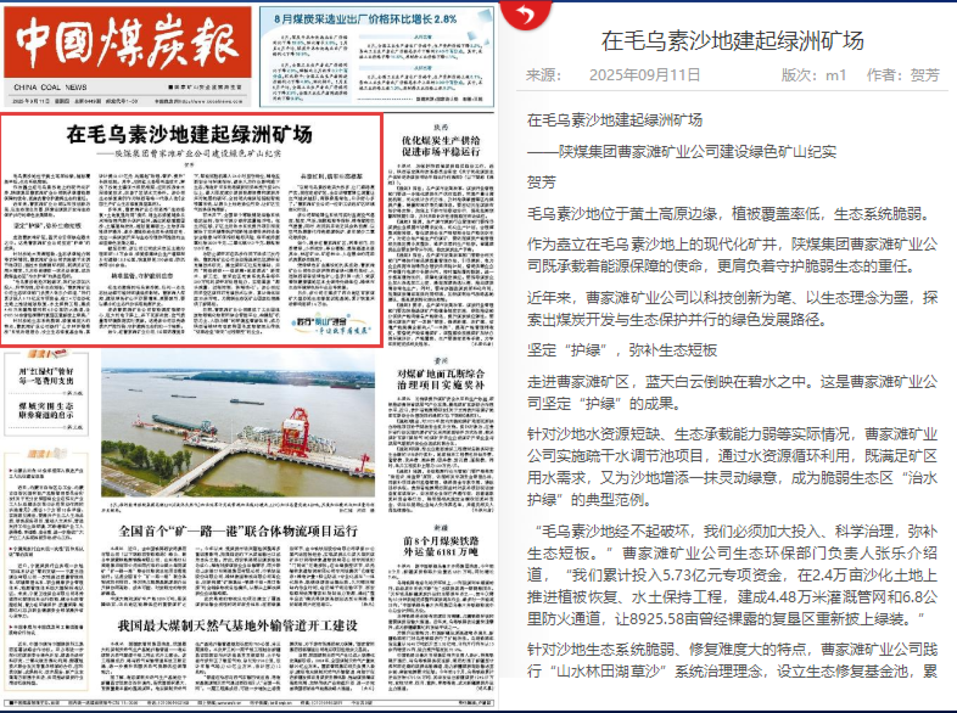 中国煤炭报 | 在毛乌素沙地建起绿洲矿场——陕煤集团曹家滩矿业公司建设绿色矿山纪实