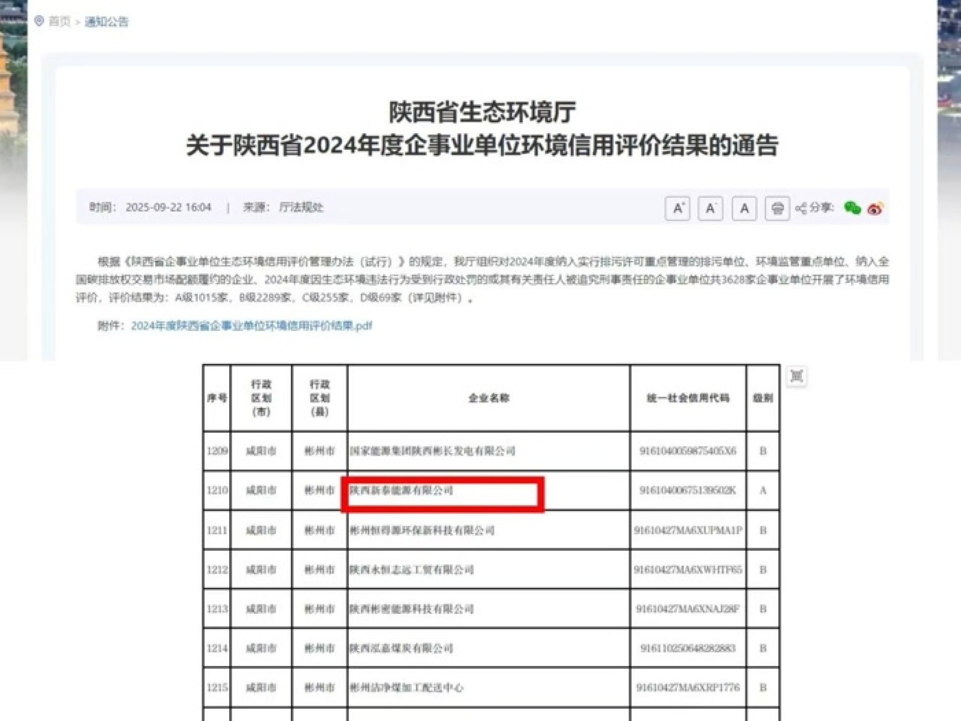 陕西省煤层气新泰能源公司荣获陕西省2024年度环境信用评价A级权威认可