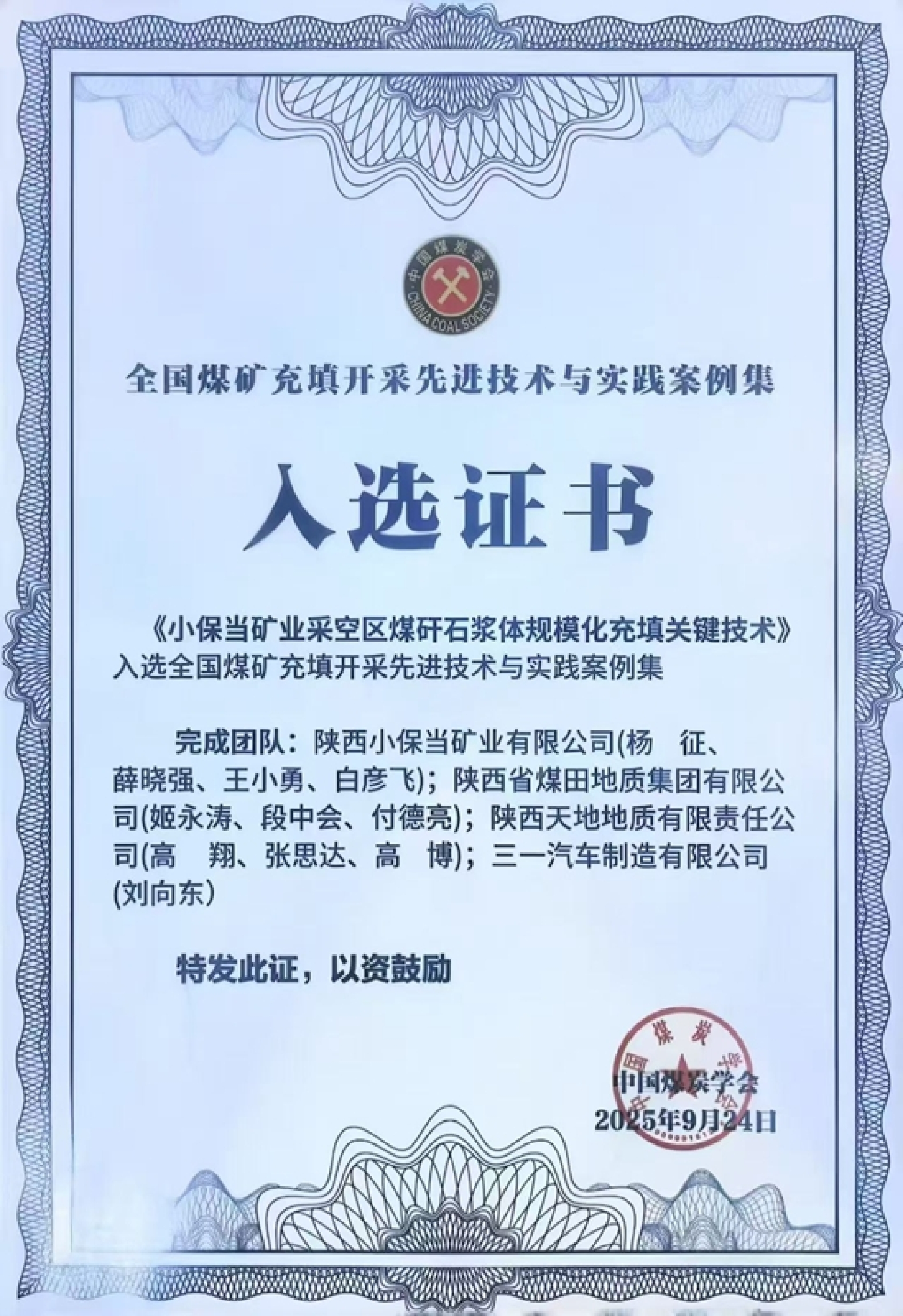喜讯!小保当矿业公司“采空区煤矸石浆体规模化充填关键技术”入选全国煤矿充填开采先进技术与实践案例集